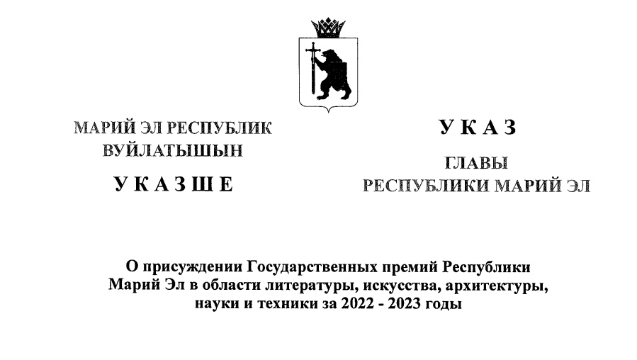 Глава Марий Эл Юрий Зайцев подписал указ о присуждении премии в области литературы, искусства, архитектуры, науки и техники за 2022-2023 годы.