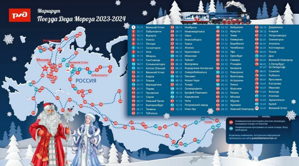 Ежегодно 11 ноября резиденция на колёсах главного волшебника страны отправляется в зимнее путешествие по России из Великого Устюга. Путешествие продлится 64 дня и завершится также в Великом Устюге 13 января 2024 года. Всего в этом сезоне поезд проедет более 32 тысяч км.