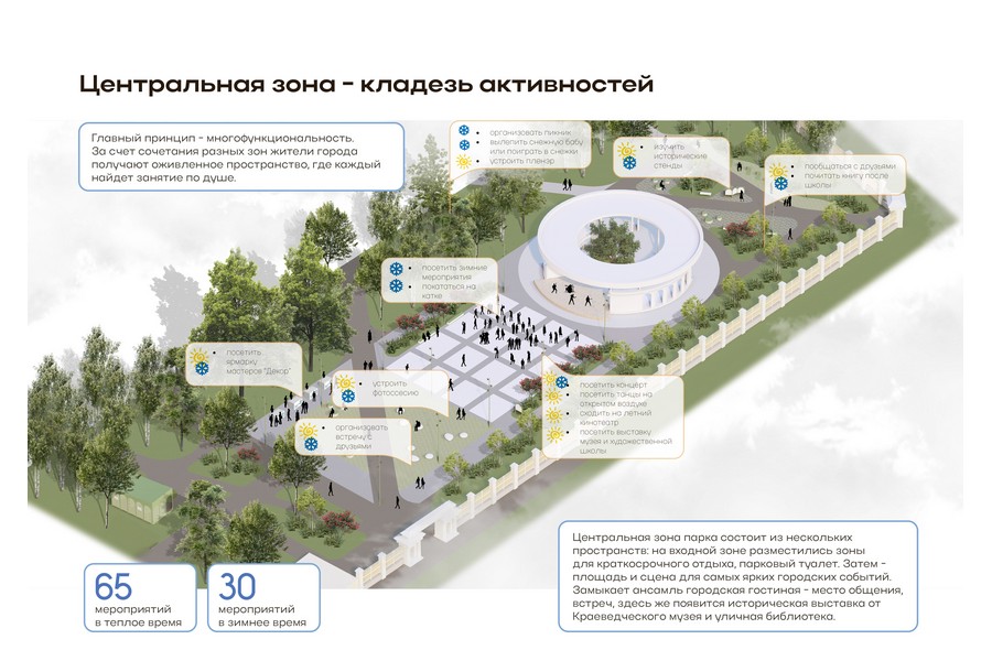- Проект предполагает обновление парка культуры и отдыха площадью свыше 6 га. Планируется обустроить входную группу, отремонтировать пешеходные дорожки, установить уличную мебель, создать площадь для проведения мероприятий, детские игровые площадки и спортивные зоны, территорию отдыха у воды, реконструировать мост через реку Коноплянка.