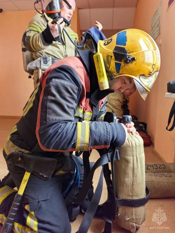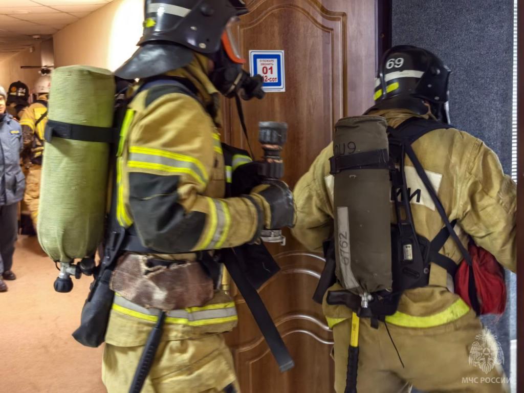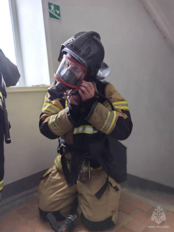 Огнеборцы с помощью спасательных устройств типа «капюшон» вывели из здания условных пострадавших. На улице был развернут оперштаб пожаротушения.