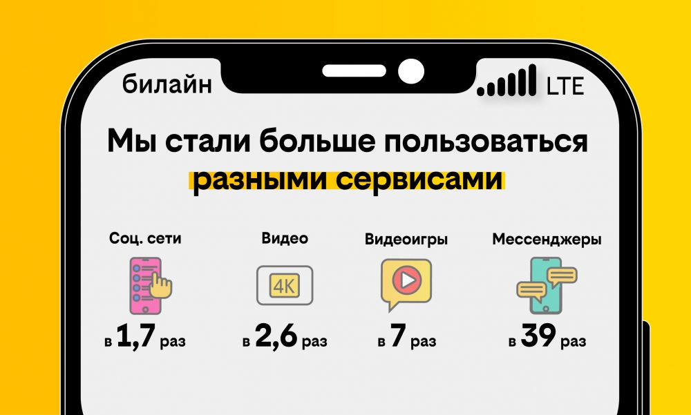 Благодаря развитию сети и технологий клиенты оператора стали больше общаться с близкими, чаще звонить по видеосвязи, играть онлайн, смотреть видео и узнавать новое. В итоге объем трафика, который ежемесячно использует один клиент билайн, увеличился в 4 раза.