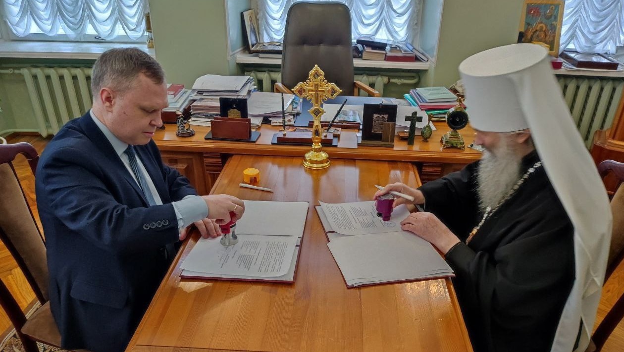 Председатель Комитета Станислав Игошин и митрополит Йошкар-Олинский и Марийский Иоанн подписали соглашение.
