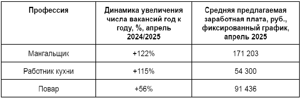 По данным Авито Работы, спрос на мангальщиков в России вырос на 122% по сравнению с апрелем прошлого года. Средняя предлагаемая зарплата для таких специалистов — 171 203 руб./мес.