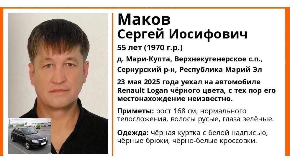 В Сернурском районе 23 мая пропал Сергей Маков на Renault Logan