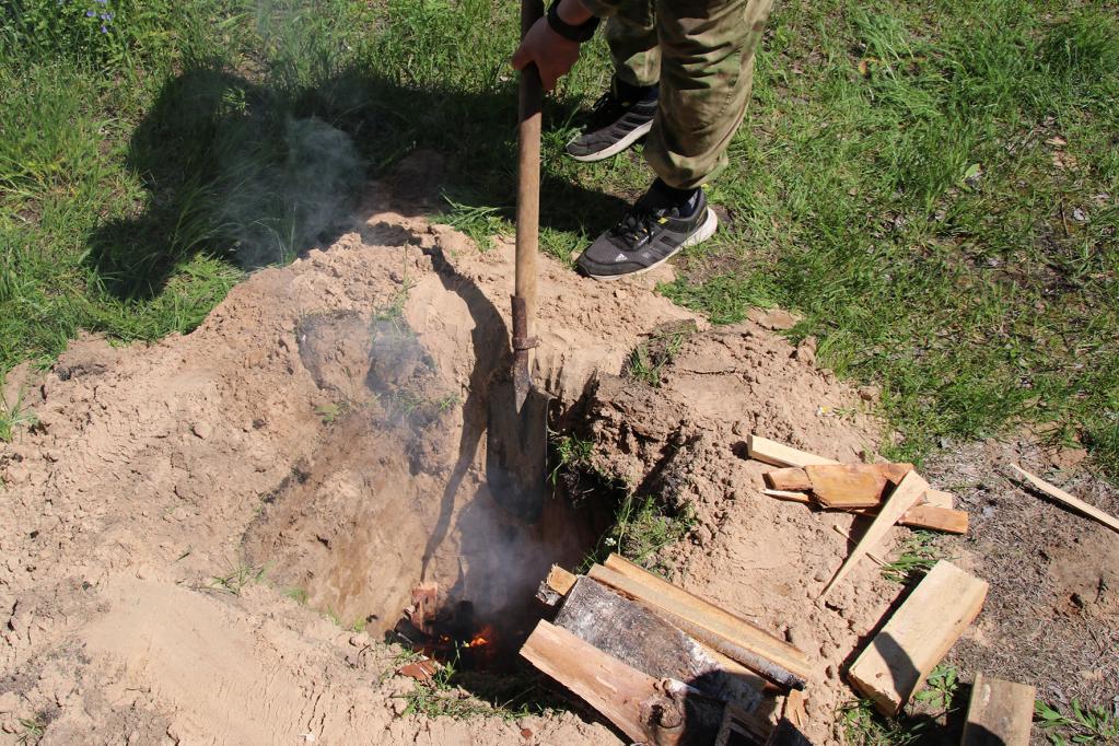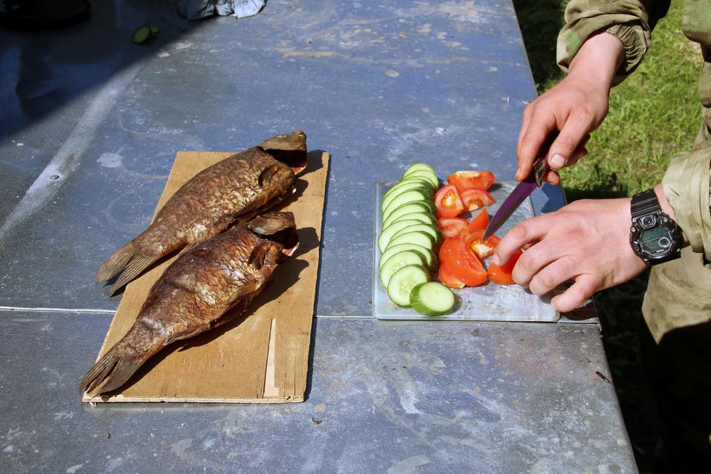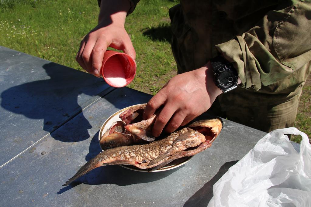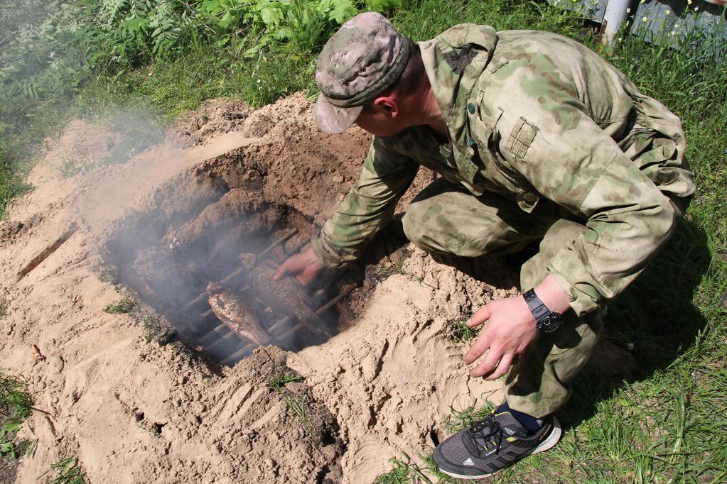 Тщательно очищенных карасей натирают солью и чёрным перцем (впрочем, выбор специй зависит от пристрастий кулинара). Подготовленную рыбу 30–40 минут маринуют в пакете, оставив его в тенёчке. Тем временем обустраивается полевая коптильня: бойцы разводят костёр, чтобы обеспечить себя углями, и выкапывают в земле небольшой очаг с дымоотводом, обеспечивающим свободную циркуляцию воздуха. Размеры коптильни зависят от величины рыбы, в данном случае оказалось достаточно 25-сантиметрового углубления. Параллельно готовится гарнир — картофель, запечённый на углях, и нарезают свежие овощи.