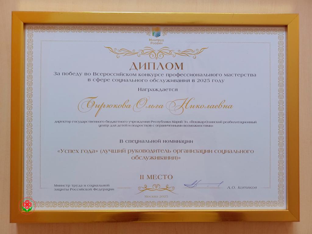 Директор Йошкар-Олинского реабилитационного центра для детей и подростков с ограниченными возможностями Ольга Бирюкова заняла второе место на всероссийском конкурсе профмастерства в сфере социального обслуживания в номинации «Успех года».