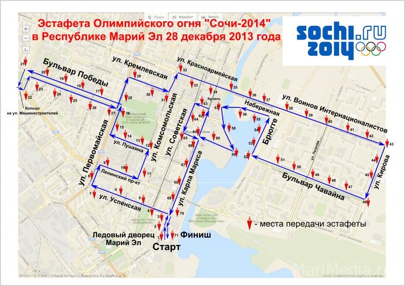 Напомним, она стартует от ледового дворца «Марий Эл». Далее путь продолжится по улицам Успенской, Первомайской, Ленинскому проспекту, Комсомольской, Пушкина. Затем снова поворот на Первомайскую и по бульвару Победы до стадиона «Дружба». Там снова по бульвару обратно на Первомайскую, поворот на Кремлевскую и Комсомольскую. Далее — в Сомбатхей по Красноармейской и Воинов интернационалистов. Поворот на Кирова и выход на бульвар Чавайна. Затем — набережная Брюгге, Патриаршая площадь, снова набережная, площадь Девы Марии. Через Вознесенскую — выход к Царевококшайскому Кремлю. А далее по Советской, бульвару Чавайна, Вознесенской и Карла Маркса снова к ледовому дворцу «Марий Эл», где пройдет большое торжественное мероприятие.
