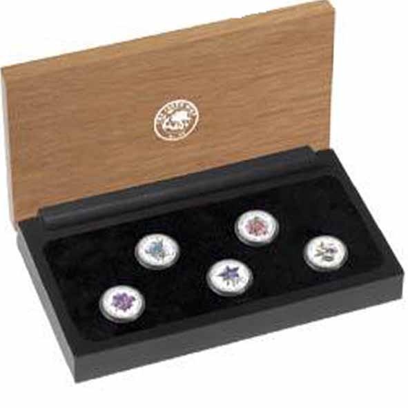 Более дорогим подарком может стать набор из пяти монет с изображением цветов. Монеты выполнены из платины и помещены в футляр из дуба.