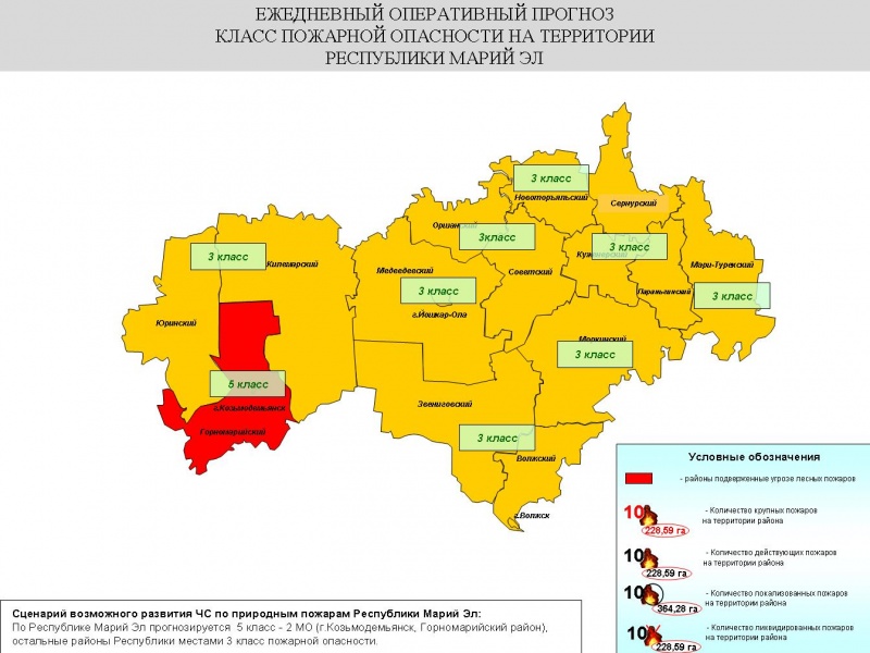 Специалисты отмечают, что по состоянию на 7 августа в Горномарийском районе и прилегающей лесозоне к городу Козьмодемьянску объявлен наивысший класс пожарной опасности — пятый, сообщили в ГУ МЧС РФ по Марий Эл.