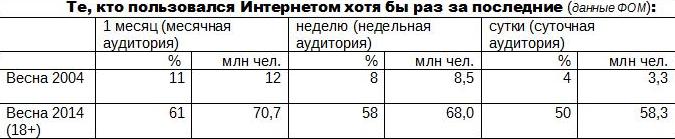 По данным фонда «Общественное мнение», 70,7 млн россиян старше 18 лет выходят в Сеть хотя бы раз в месяц (это 61% всего совершеннолетнего населения страны), а 58,3 млн человек (50%) пользуются интернетом каждый день.