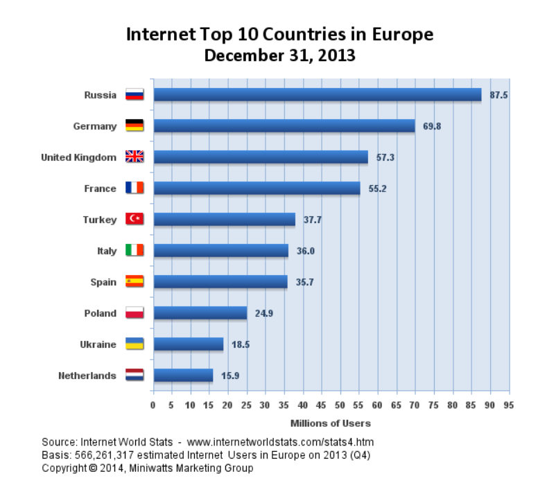 Впервые день интернета в России отмечался в 1998 году. Тогда доступ к Сети имел 1 млн россиян. Сейчас наша страна занимает 1-е место в Европе по количеству пользователей (87,5 млн). На втором и третьем месте — Германия (69,8 млн) и Великобритания (57,3 млн).