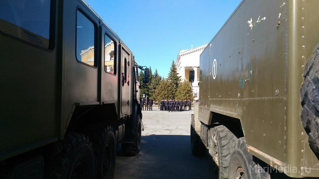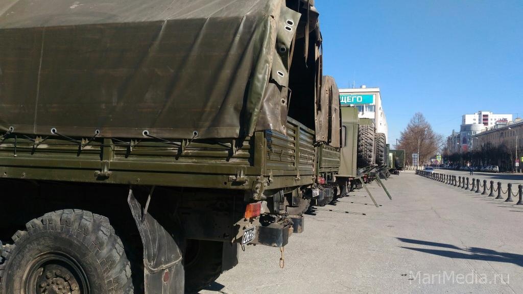 Центр Йошкар-Олы закрыт для гражданской автотехники, на площади им. Ленина выстроились колонны военных машин. Первые «коробки» юнармейцев, МВД, военных маршируют по Ленинскому проспекту.