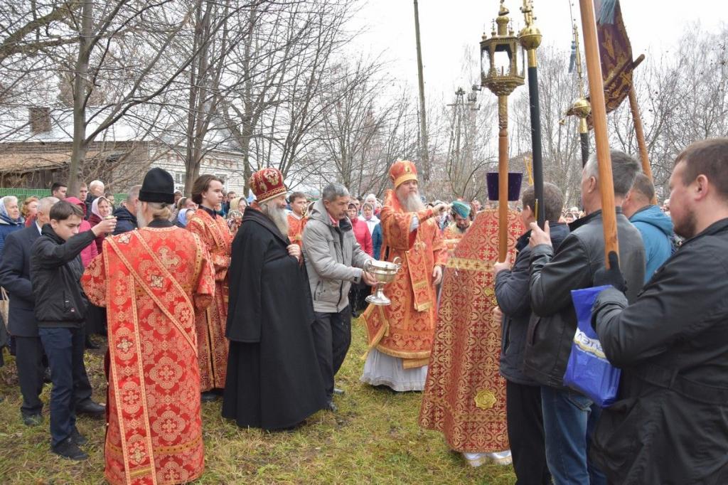 После литургии прошел крестный ход вокруг храма с чтением Евангелия и кроплением святой водой.