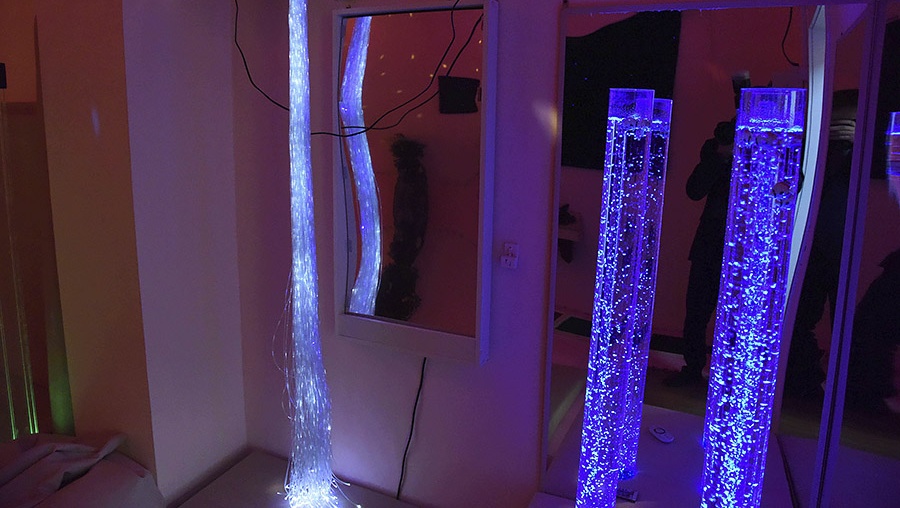 В сенсорной комнате, наполненной живой сказкой, всеми цветами радуги переливаются оптоволоконные нити, вверх поднимаются воздушные пузырьки, вращается зеркальный шар, имитирующий движение солнечных зайчиков, переливаются голоса птиц либо слышен шум морского прибоя.
