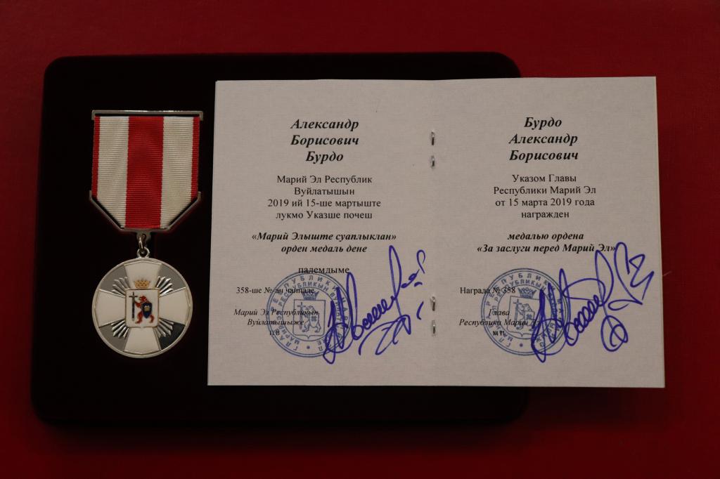 Указом Главы Марий Эл № 34 за вклад в обеспечение государственной и общественной безопасности в республике и добросовестное исполнение служебных обязанностей начальник регионального Управления Росгвардии, полковник полиции Александр Бурдо награжден медалью ордена «За заслуги перед Марий Эл», сообщает пресс-служба ведомства.