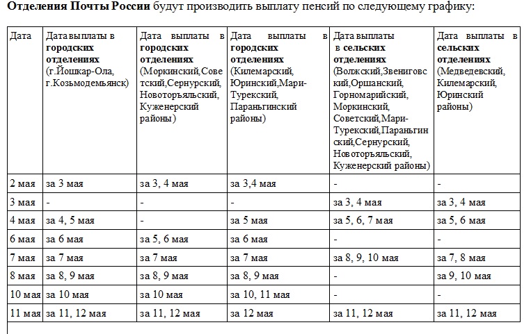 График доставки пенсий АО «Служба доставки» в Йошкар-Оле и Медведевском районе: