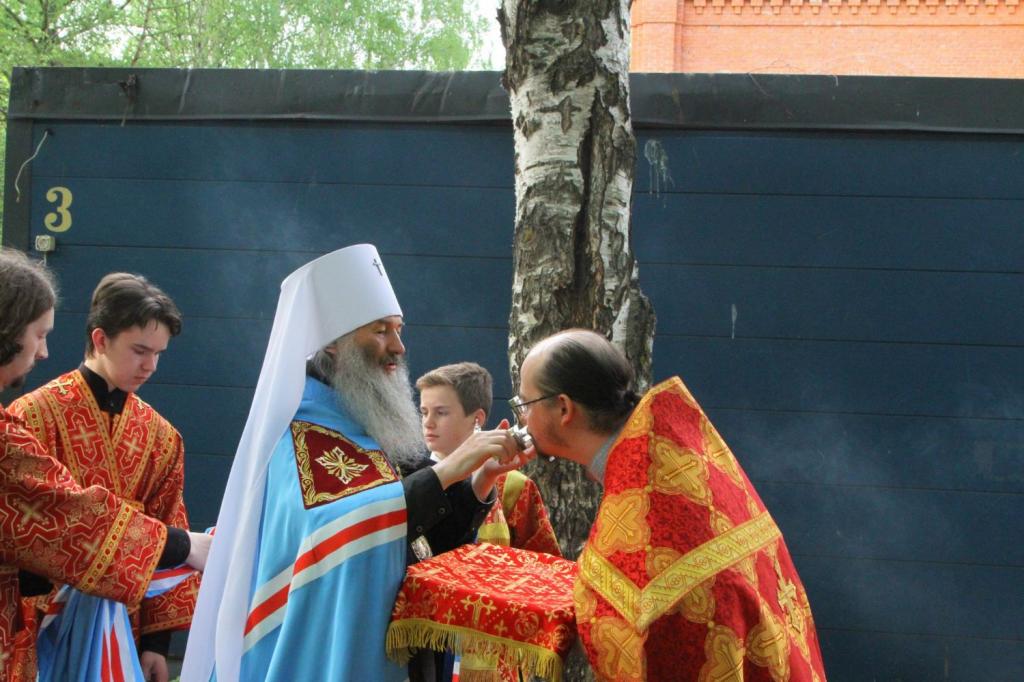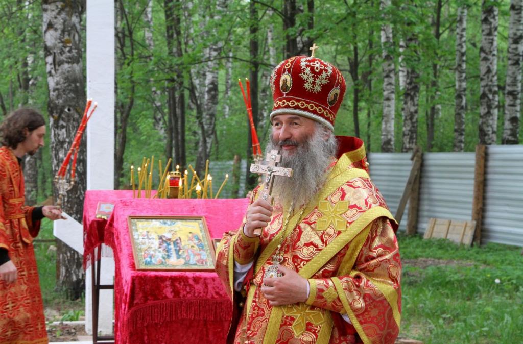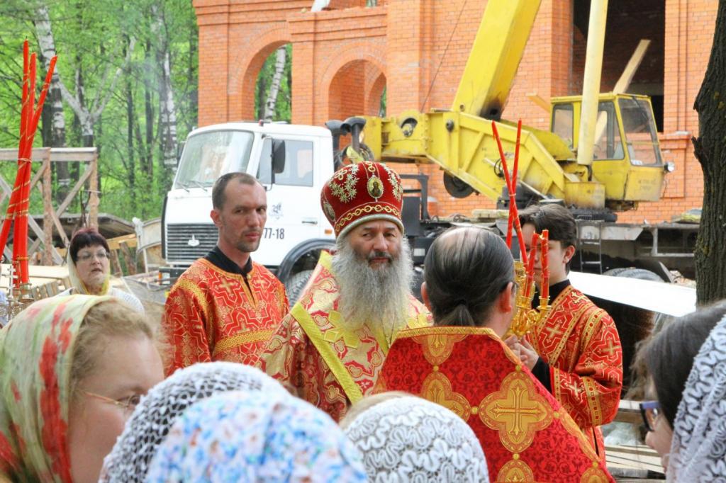Митрополит Иоанн возглавил вечерню с чтением акафиста на территории строящегося храма в честь иконы Божьей Матери «Всех скорбящих Радость» в Тарханово. После этого состоялся крестный ход. Владыка окропил стены храм и молящихся святой водой.
