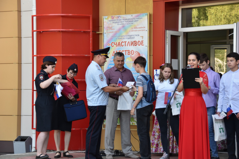 Накануне праздничные мероприятия прошли и в посёлке Медведево. Начальник Управления по вопросам миграции МВД по Республике Марий Эл Алексей Дмитриев поздравил юных жителей Медведевского района и вручил им паспорта.