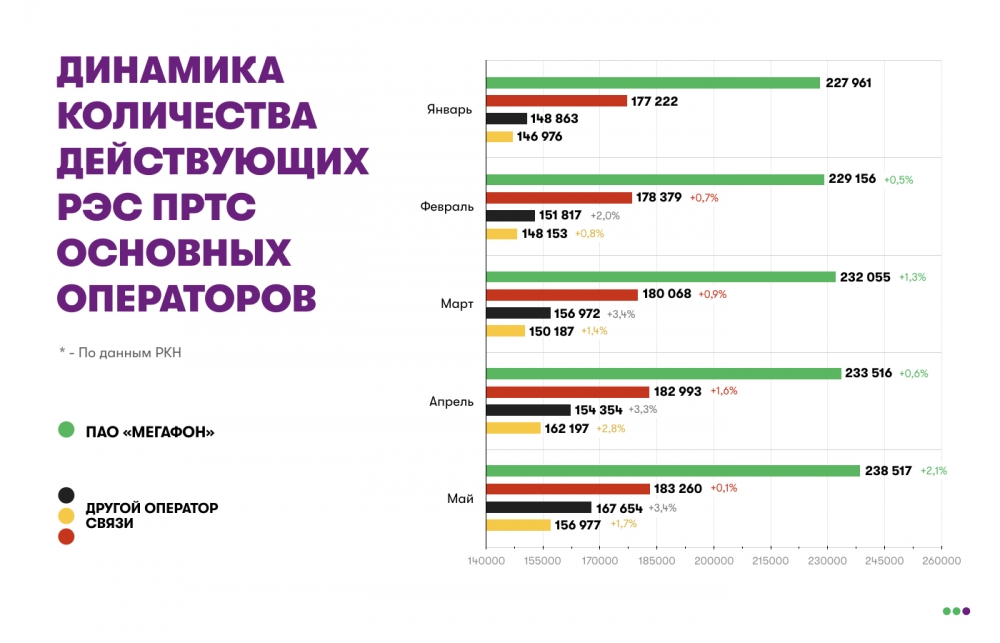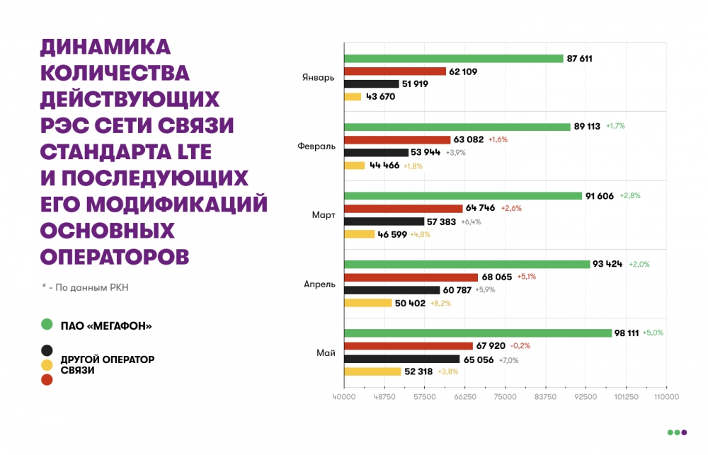 По данным Роскомнадзора, за 5 месяцев 2019 года количество базовых станций стандарта 4G операторов «большой четвёрки» в России выросло на 16% до 283,4 тыс. объектов, говорится в отчёте Роскомнадзора. При этом МегаФон владеет наибольшим числом базовых станций стандарта 4G — 98,1 тыс., а показатели остальных конкурентов значительно ниже — 67,9 тыс, 65,2 тыс. и 52,3 тыс.