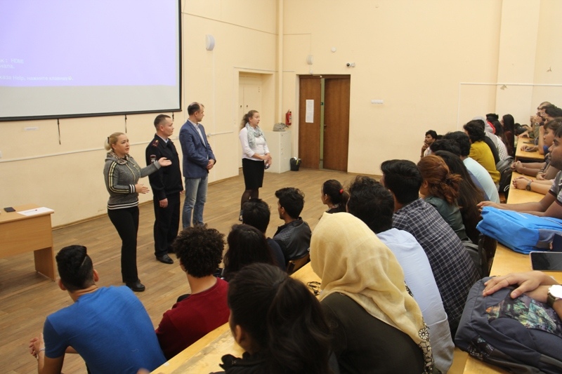 На встрече с иностранными студентами из Индии, Египта и Ирака инспектор отделения по пропаганде безопасности дорожного движения УГИБДД МВД по Республике Марий Эл Петр Николаев рассказал об основных правилах дорожного движения Российской Федерации для пешеходов и водителей.