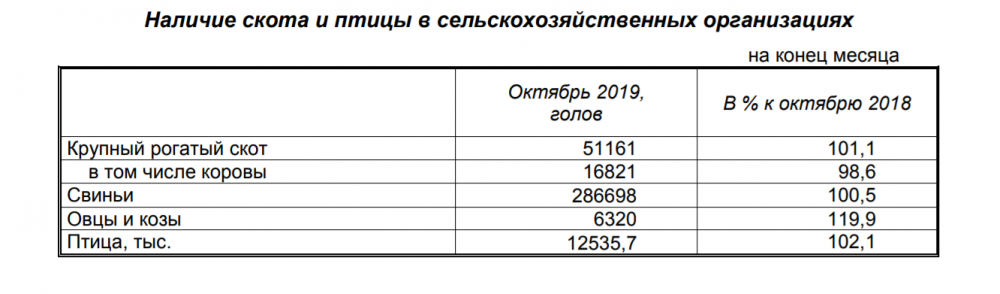 В сельскохозяйственных организациях на конец октября поголовье крупного рогатого скота увеличилось на 1,1%, из него поголовье коров уменьшилось на 1,4%; поголовье свиней увеличилось на 0,5%, овец и коз — на 19,9%, птицы — на 2,1%.