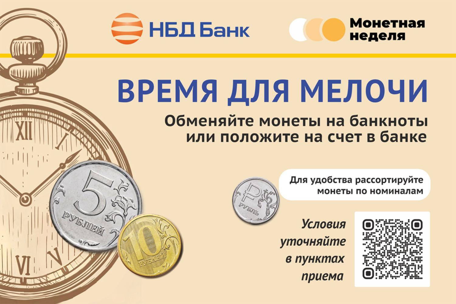 НБД-Банк приглашает принять участие во Всероссийской акции «Монетная неделя». Она пройдет с 6 по 18 апреля. В этот период любой желающий может обменять накопившиеся рублевые монеты разного номинала на банкноты, эквивалентные сданной сумме или памятные монеты (при наличии). Для участников акции действует льготное условие — отменена комиссия за пересчет и взнос наличности. Кроме того, клиенты НБД-Банка могут зачислить эквивалент сданной суммы на текущий счет.