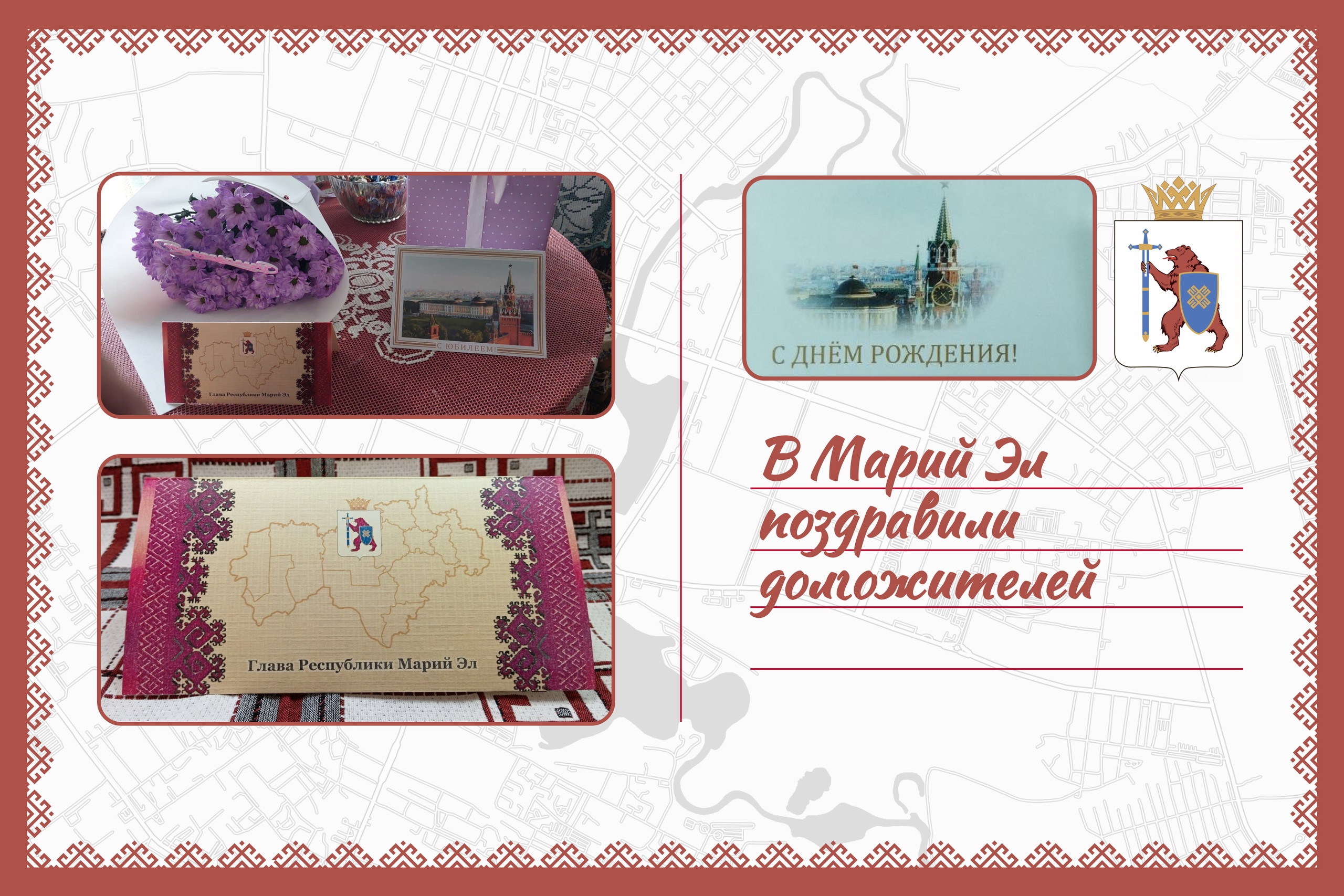 В прошлом году в адрес юбиляров направлено 187 поздравлений — от президента России Владимира Путина и 56 — от главы Марий Эл Юрия Зайцева. Поздравления получают долгожители, отметившие 90, 95 и 100-летний юбилей.