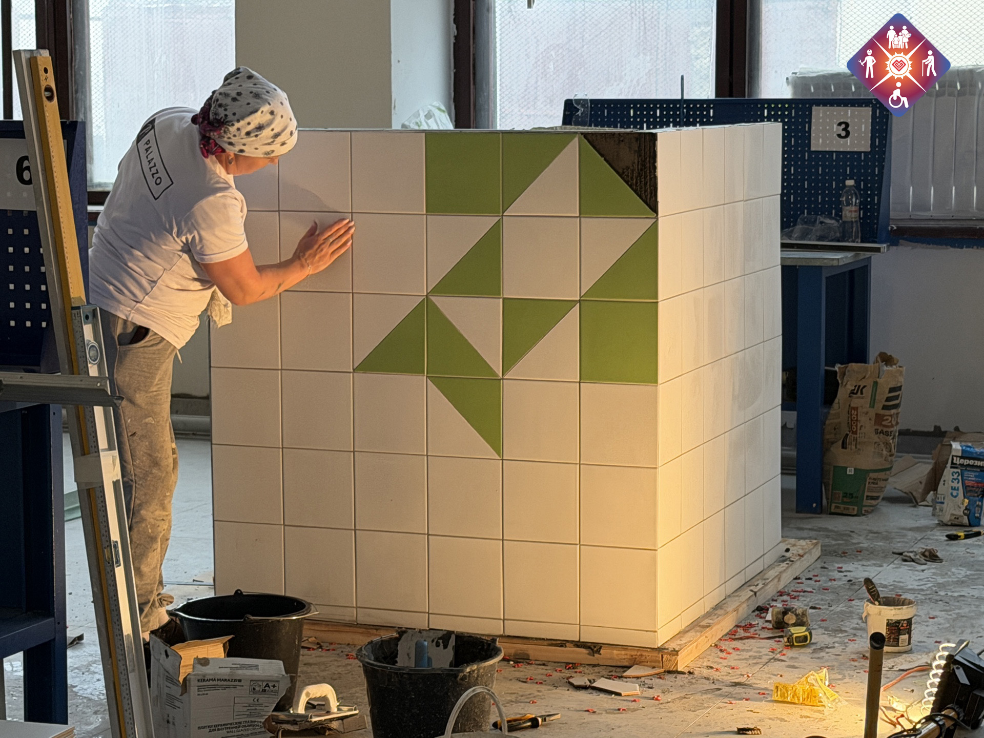 В условиях ограниченного времени мастерам предстояло собрать металлический каркас, обшить его гипсокартоном, выполнить шпатлевание, оклеить внутренние поверхности обоями и уложить керамическую плитку снаружи.