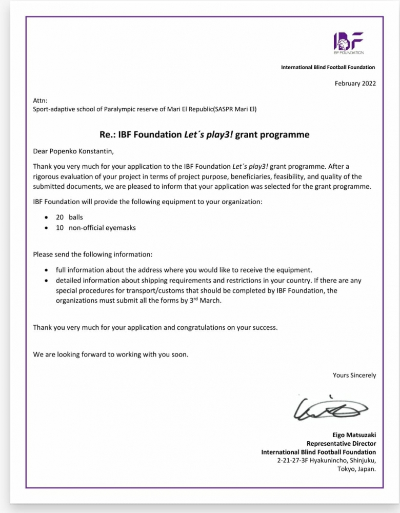 Заявка учреждения прошла конкурс в программе «Lets play3!», организатором которой является Международный Фонд поддержки слепых футболистов.