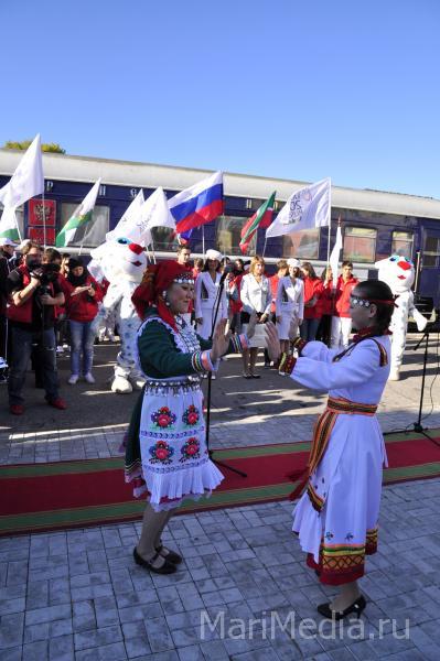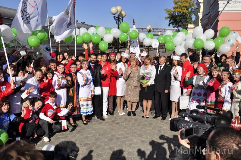 Программа пребывания гостей из Татарстана на марийской земле была очень насыщенной. Утром на железнодорожном вокзале – приветственные речи, а в качестве подарков – «пуд соли» и чак-чак, как знак солидарности и единства в подготовке к спортивным студенческим стартам. Далее – автопробег по центральным улицам города с финишем у Царевококшайского Кремля, где было показано военно-историческое представление.