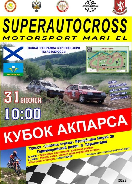 В воскресенье, 31 июля, в Горномарийском районе состоятся соревнования по автомобильному спорту «Кубок Акпарса» в честь Дня Военно-морского флота и Воздушно-десантных войск. Мероприятие проводится при поддержке Регионального отделения ДОСААФ России Марий Эл и спортивно-технической организации «Моторспорт» ДОСААФ.