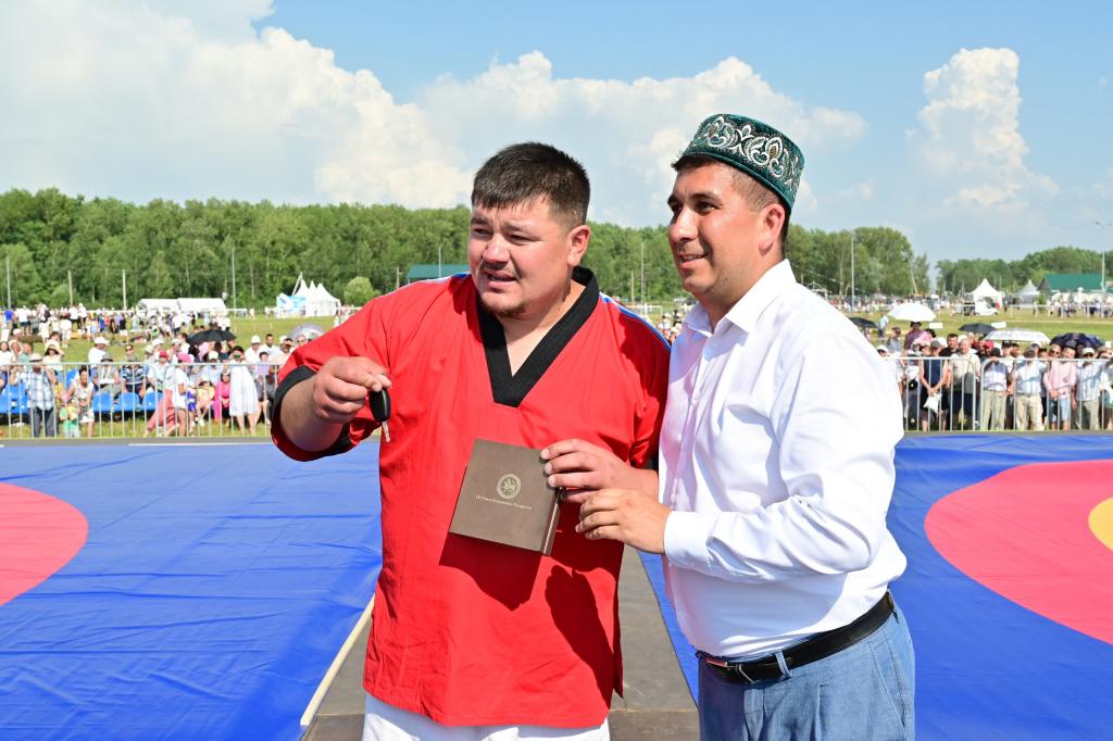 По итогам упорной борьбы абсолютным победителем и самым сильным батыром признан уроженец Марий Эл, проживающий сейчас в Татарстане, Муса Галлямов. За победу ему вручили ключи от новенькой Lada Granta и барана.