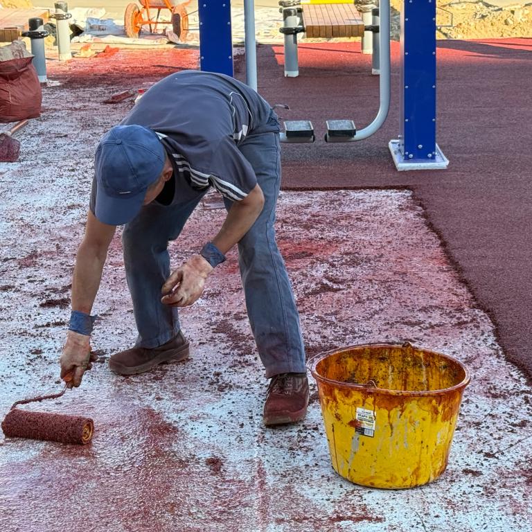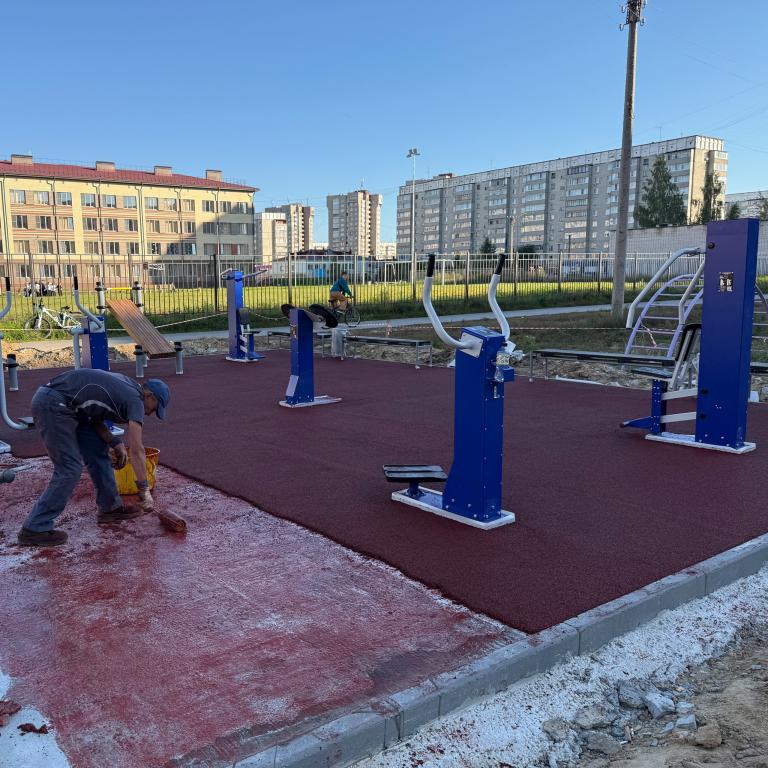 Подрядчики уже установили здесь 13 уличных тренажёров и уложили резиновую крошку на бетонное основание. Как только покрытие высохнет, ограничительные ленты снимут и можно будет заниматься спортом.