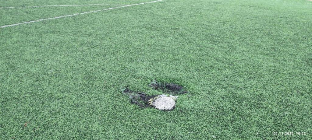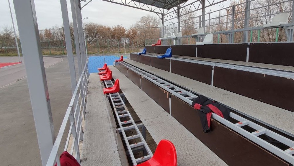 Из 100 сидений на трибуне под навесом осталось только 15! Тренажёр крепится пятью гайками из 20, на футбольном поле яма, ворота поломаны. Не хватает одной камеры видеонаблюдения.
