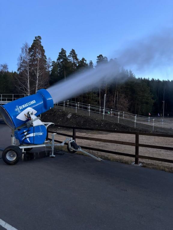 И вот уже на лыжной базе города можно кататься по свежему насту. На 200-метровый участок уложили искусственный снег. Изготовили его при помощи специального оборудования.