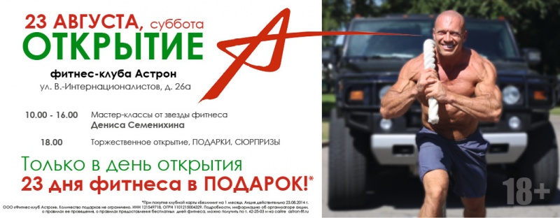 Да, кстати, если вы не успеете на бесплатные тренировки, которые пройдут в новом клубе с 10 до 16, то обязательно надо быть в 18.00 на Воинов-Интернационалистов 26а и принять участие в торжественном открытии и розыгрыше подарков от фитнес-клуба «Астрон» и партнеров.