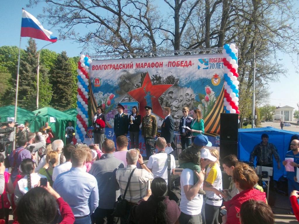 На торжественном открытии Волгоградского марафона присутствовали ветераны Великой Отечественной войны. В рамках праздника состоялся благотворительный забег «1945 шагов Победы», в котором приняли участие знаменитые олимпийские чемпионки Елена Исинбаева, Татьяна Лебедева и Елена Слесаренко.