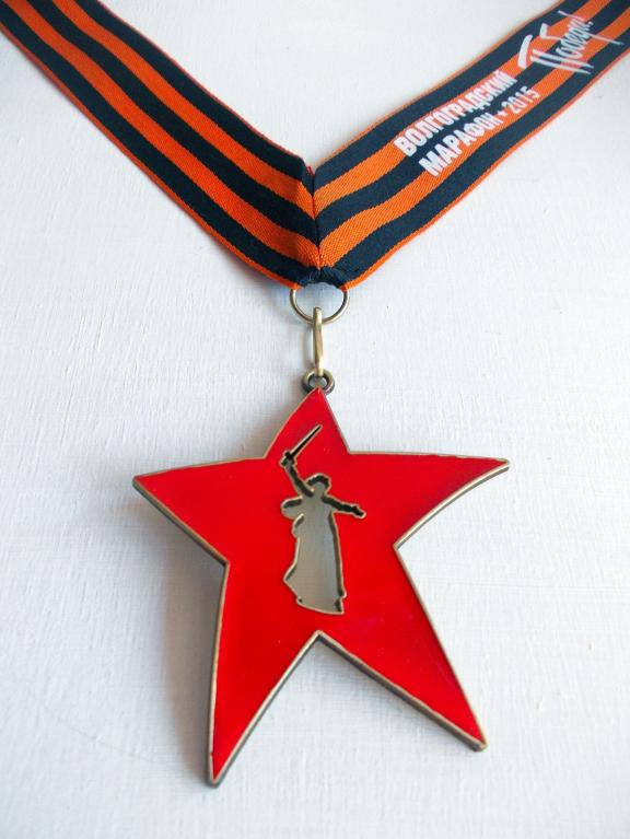 Все участники Волгоградского марафона удостоились памятной медали, выполненной в форме красной пятиконечной звезды с силуэтом главного монумента мемориального комплекса на Мамаевом кургане, знаменитой скульптуры «Родина-мать зовёт».