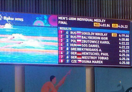 МариМедиа, 27 июня. Пловец из Марий Эл Игорь Балыбердин стал обладателем серебряной медали на дистанции 400 метров комплексным плаванием на Европейских играх в Баку. Золото завоевал также россиянин Николай Соколов, который показал время 4 минуты 19,44 секунды. У Игоря Балыбердина — 4 минуты 20,80 секунды. На третьем месте Карол Збутович из Польши (4.22,22).
