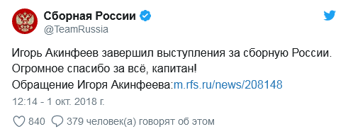 Информация об уходе Акинфеева из сборной подтверждена и на официальном канале в Твиттере.