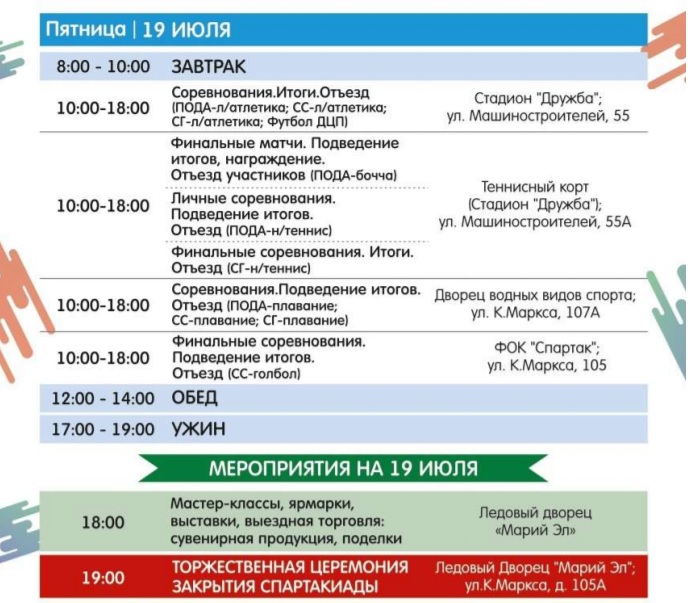 В пятницу, 19 июля, состоится заключительный день III Всероссийской Спартакиады инвалидов. Будет разыграно более 30 комплектов наград по плаванию, настольному теннису, легкой атлетике и футболу ЦП. А вечером, в 19 часов, состоится церемония закрытия и торжественное награждение команд, продемонстрировавших лучшие результаты в общекомандном зачете.