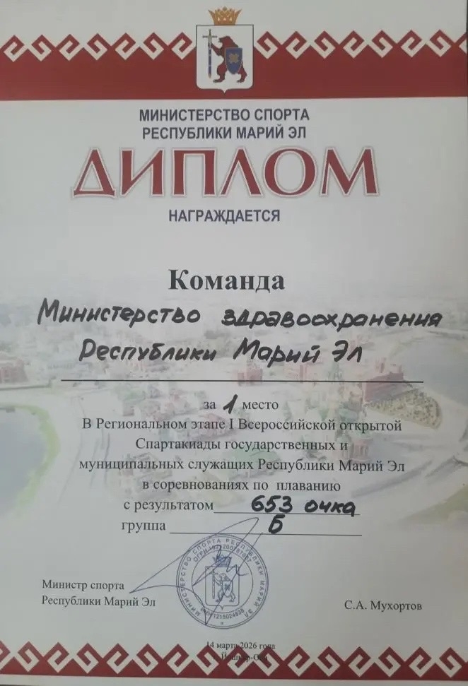 Команда Министерства здравоохранения Марий Эл заняла I место в общекомандном зачёте (группа Б) на региональном этапе I Всероссийской открытой Спартакиады государственных и муниципальных служащих в соревнованиях по плаванию и II место в эстафетном плавании.