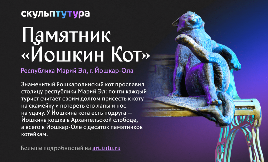 Во вторник, 24 ноября, стартовало голосование шестого раунда «скульпТУТУры» — конкурса по определению самых необычных памятников и скульптур страны. В этой десятке сразу два памятника из Марий Эл — Йошкин кот и памятник букве Й.