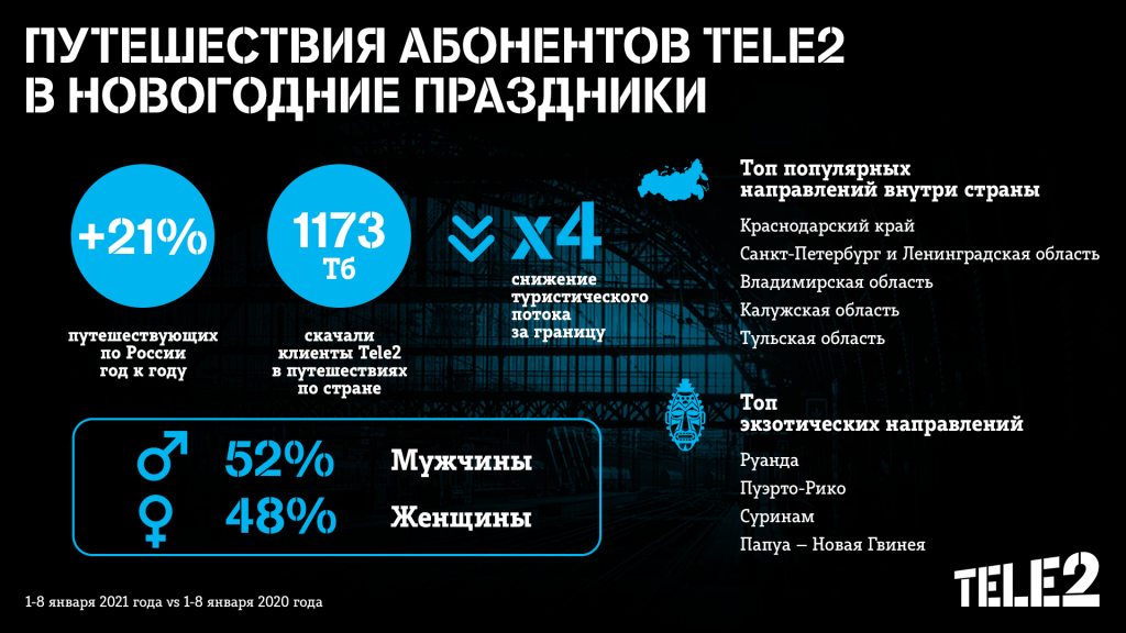 Tele2 с помощью технологии big data проанализировала направления поездок клиентов оператора в новогодние каникулы 2021-го и 2020 года. Число абонентов, которые отправились в путешествие по регионам России на длинных выходных, выросло на 21% по сравнению с прошлым годом. Центром притяжения туристов внутри страны стал Краснодарский край. Среди иностранных направлений лидером стала Турция. Общий пассажиропоток за границу сократился в 4 раза по сравнению с новогодними праздниками в 2020 году.