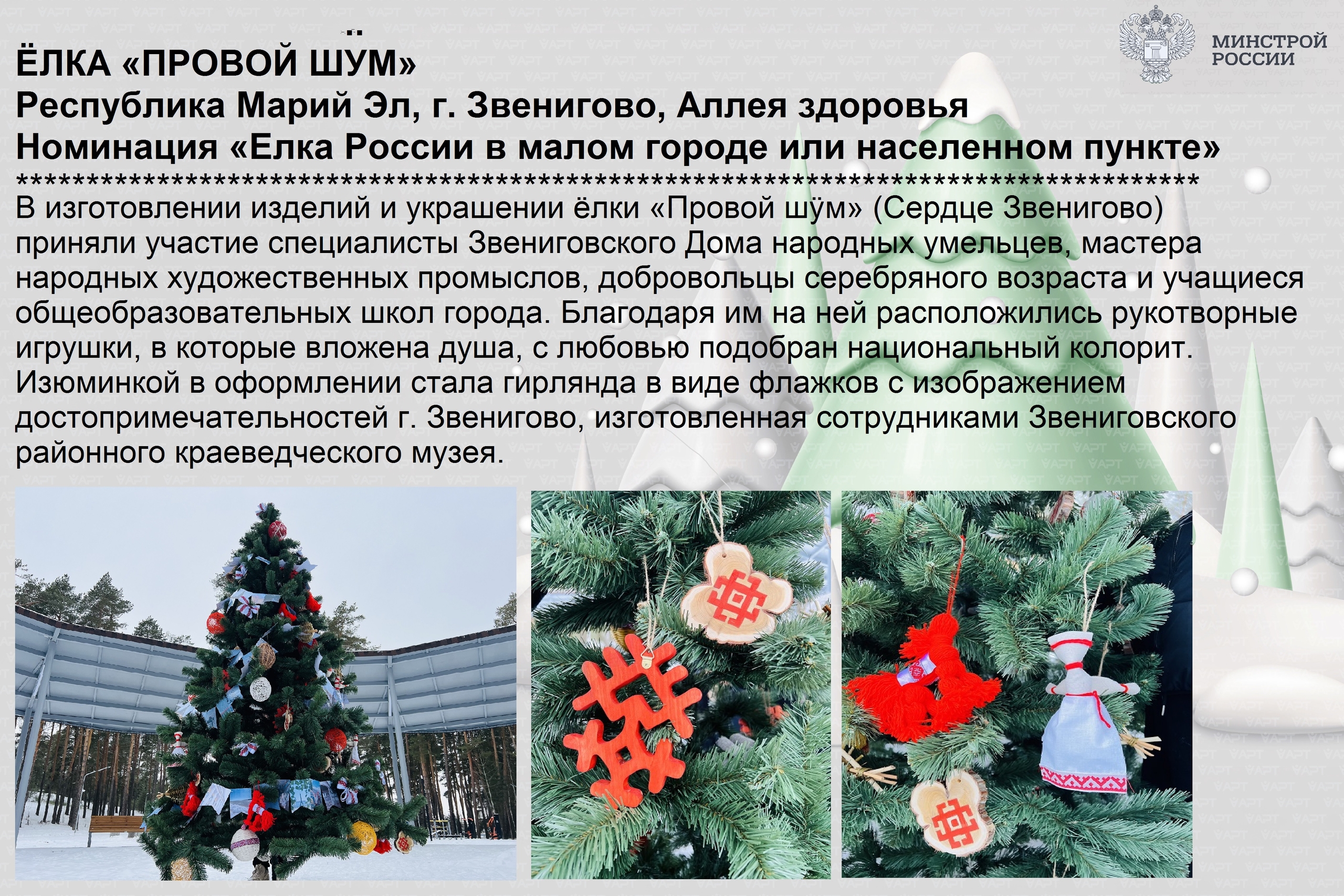Ёлка «Провой шӱм», установленная в самом сердце Звенигово, участвует во Всероссийском конкурсе «Ёлки России» в номинации «Ёлка России в малом городе или населённом пункте».