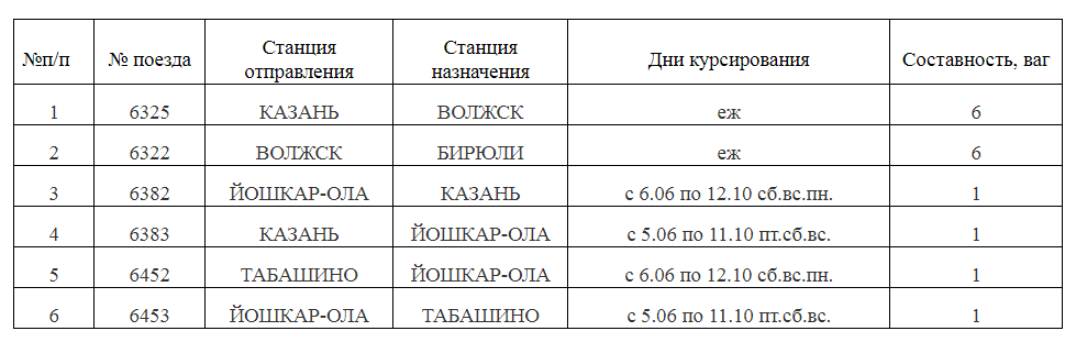 - Казань — Йошкар-Ола отправлением в 14:20, прибытием в 17:45 по пятницам, субботам и воскресеньям;