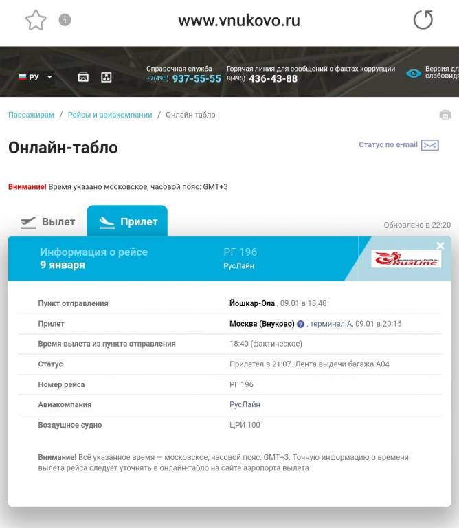 Самолёт CRJ-100, вылетевший из столицы Марий Эл накануне в 18:40, прибыл в Москву в 21:07, опоздав на 52 минуты.