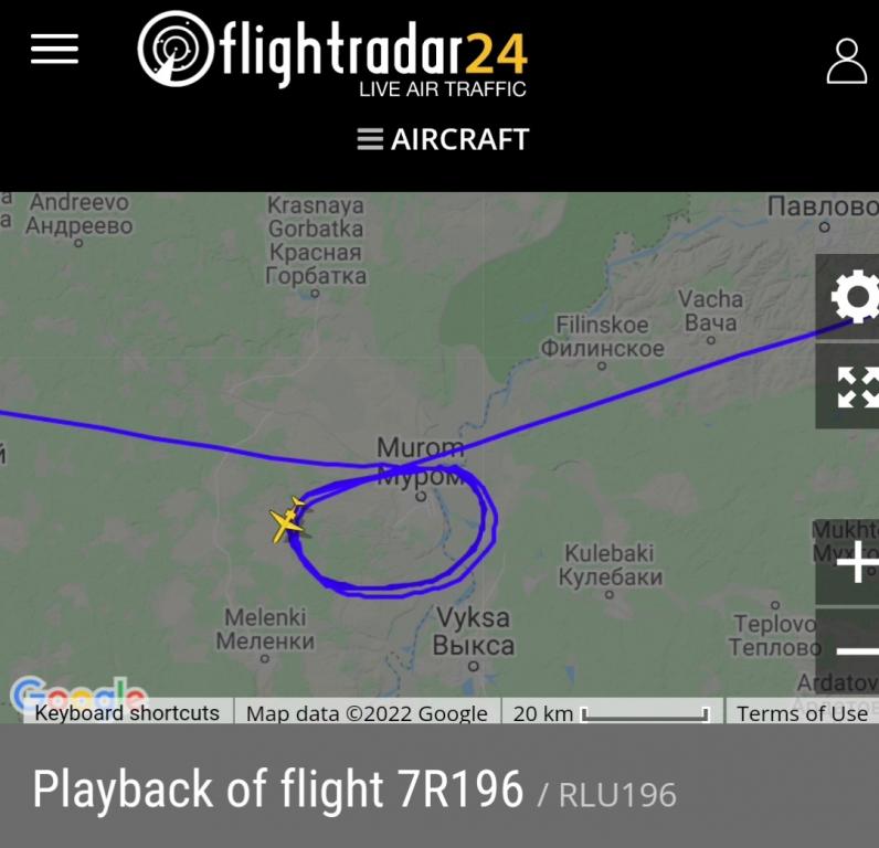 По данным Flightradar24, он сделал несколько дополнительных кругов в районе Мурома и в зоне ожидания аэропорта Внуково.
