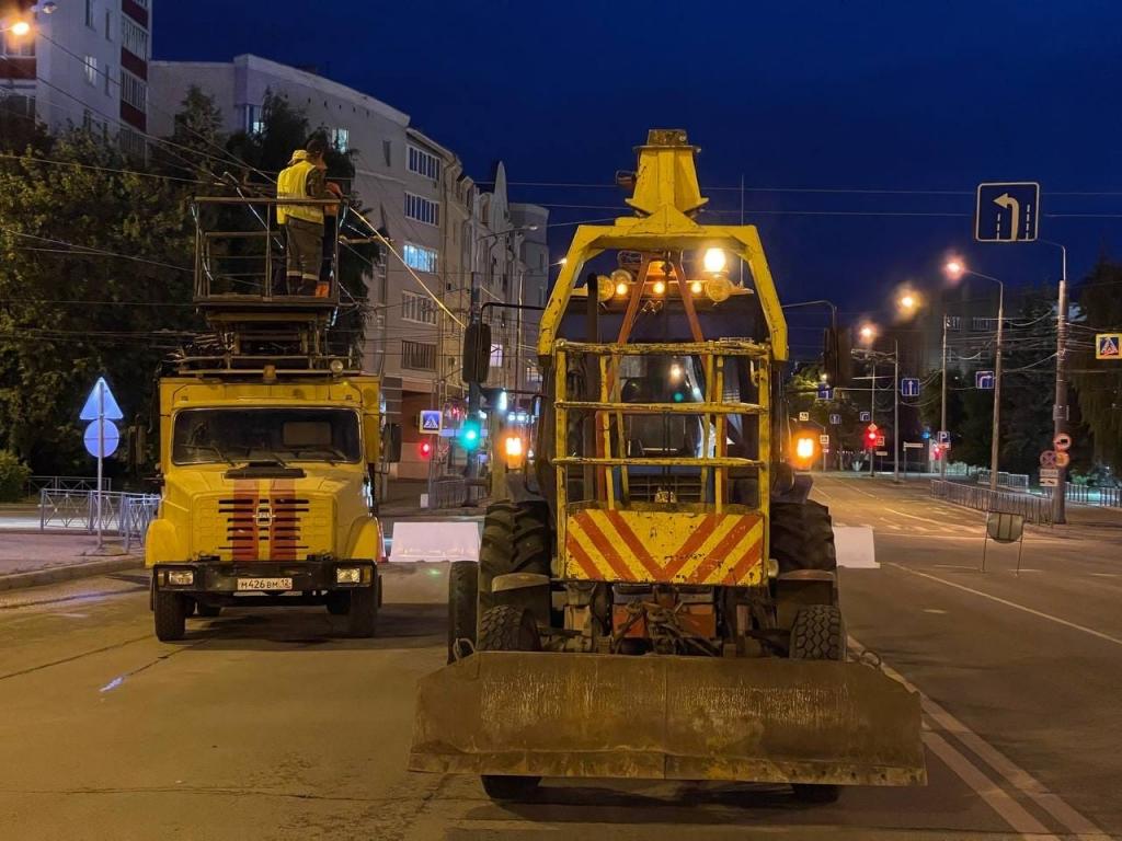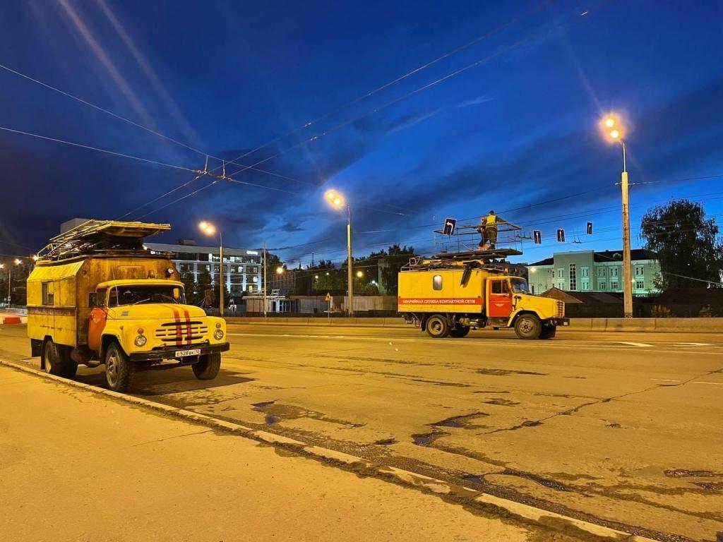 В ночь с 30 июня на 1 июля сотрудники МУП «Троллейбусный транспорт» выполнили первый этап переноса контактной сети на одну сторону Центрального моста, чтобы троллейбусы маршрутов № 2, 6, 7, 8 и 11 смогли продолжать движение по своим схемам во время ремонта мостового сооружения.