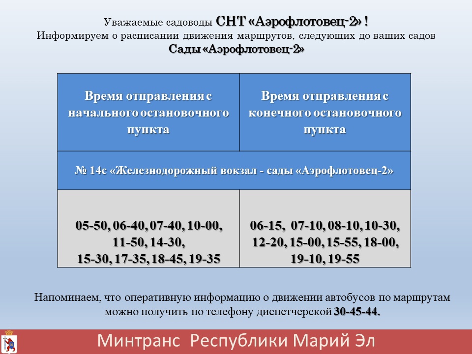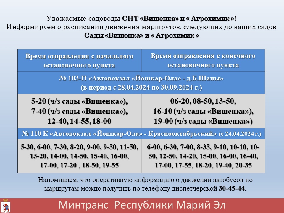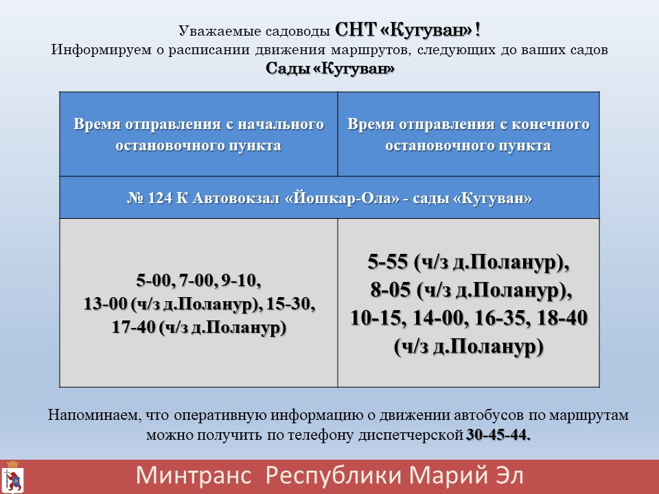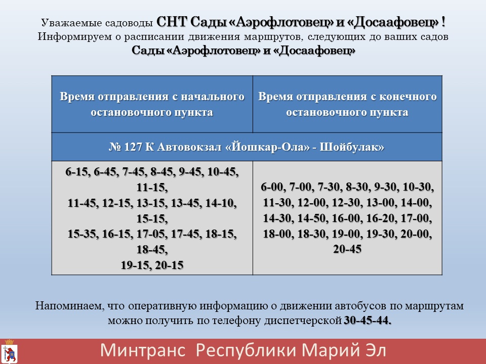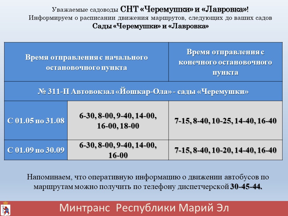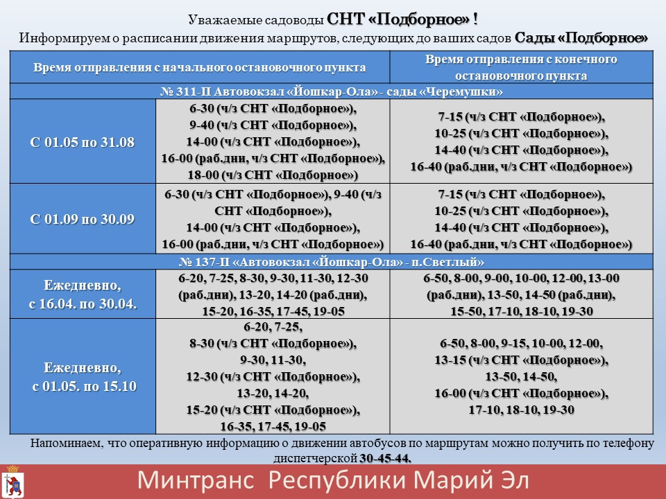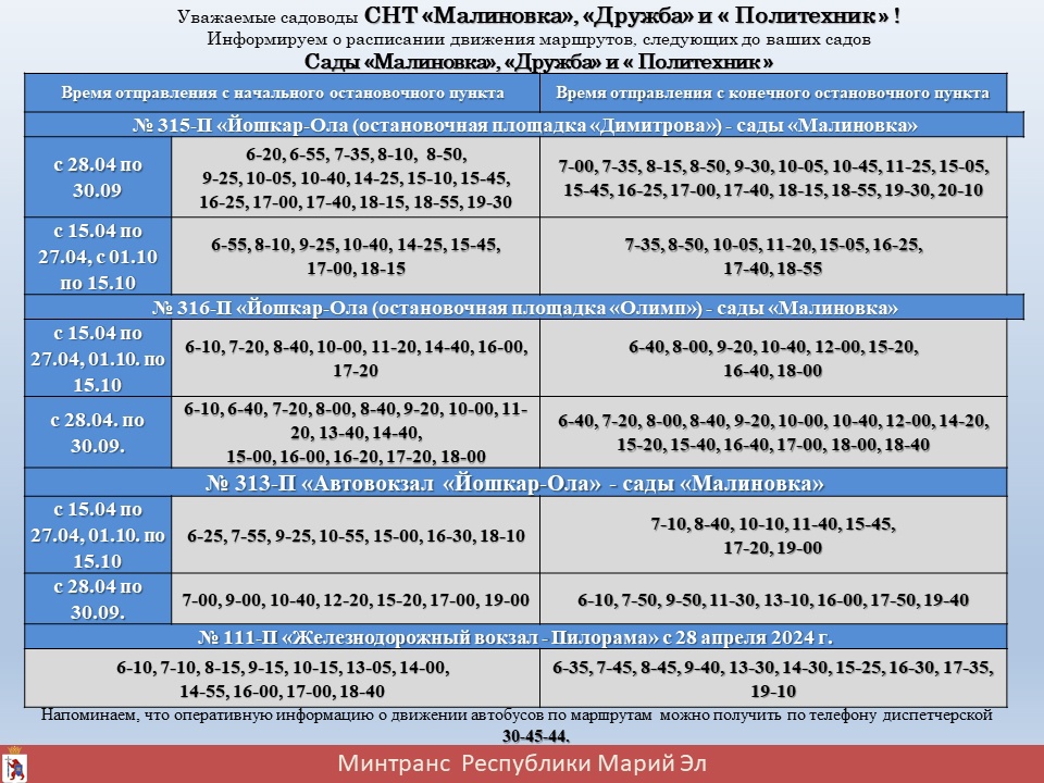 В Министерстве транспорта и дорожного хозяйства Республики Марий Эл утвердили расписание движения автобусов на летне-осенний период в СНТ.